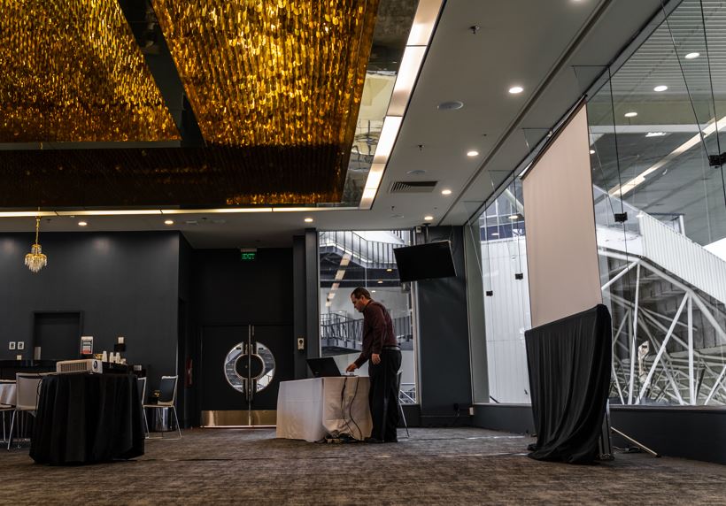 For smaller meetings of up to 100 people, a tripod screen is a great option. Tripod screens come in 6′ and 8′ dimensions, can be either 16:9 and 4:3 aspect ratios, and are flexible in an event space. They also have adjustable legs so ceiling heights aren’t a concern, and they don’t require technician setup.